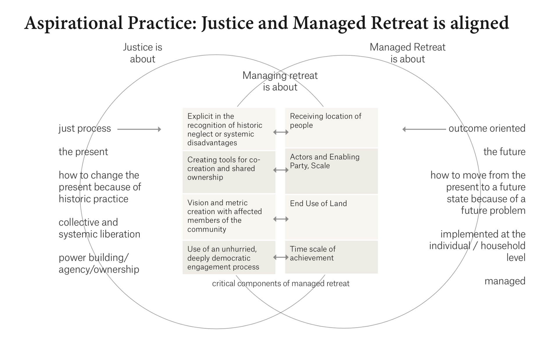 In recent years, scholars and planning practitioners have turned to managed retreat as an adaptation response to climate change. This provokes questions about how equity and justice are addressed in the relocation of people because historic planning practice has led to the marginalization of already vulnerable populations to environmentally risky areas. Through a review of the existing definitions of managed retreat and its purported benefits, this thesis asserts that the language of “managed retreat” is inherently at odds with the language of justice as understood through movement building and advocacy. Managed retreat focuses on outcomes and strategies for the removal of assets from risk rather than developing processes of transformational change for the relocation of people. Managed retreat does not focus on power building and creating recognitional, procedural and distributional justice in the face of climate impacts. Using this review and case study analysis, this thesis outlines the critical components of retreat that current planning practice fails to meet in regards to both the benefits of retreat and outcomes of a just process. Through a speculative spatial analysis, this thesis also outlines a sample method for planners and policy makers to apply the process of managing retreat, a reconceptualization of managed retreat with the focus on a just and deeply democratic process. The result a proposed relocation suitability index that identifies the potential areas communities may move to, in order to understand the opportunities, challenges and constraints of relocation. The analysis reaffirms that a community’s collective ownership over place is central to the role of planning practice in conveying and creating a life-enhancing, equitable and legitimate future that meets the needs of all people.